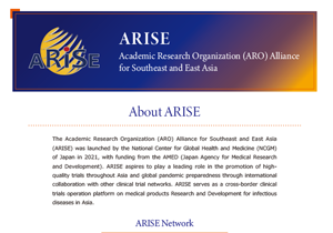 Joint Siriraj-NCGM Symposium 5th NCGM/CCS/DIT Symposium on Clinical Research and Trials will be held on 22 November 2024 at Siriraj Hospital Faculty of Medicine, Mahidol University, Bangkok, Thailand. Please register for online participation.The recording of the symposium can be accessed by ARISE members through the member login. - Event